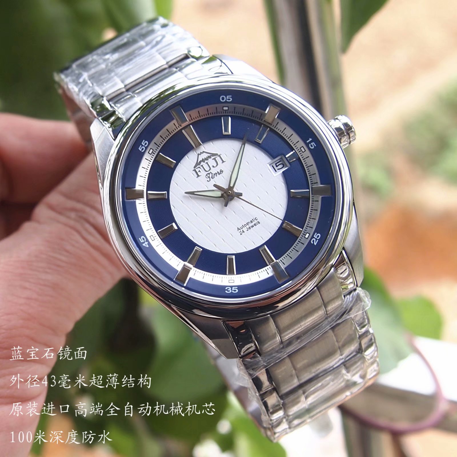 43毫米大表盘间蓝色单历超薄结构全自动机械男腕表