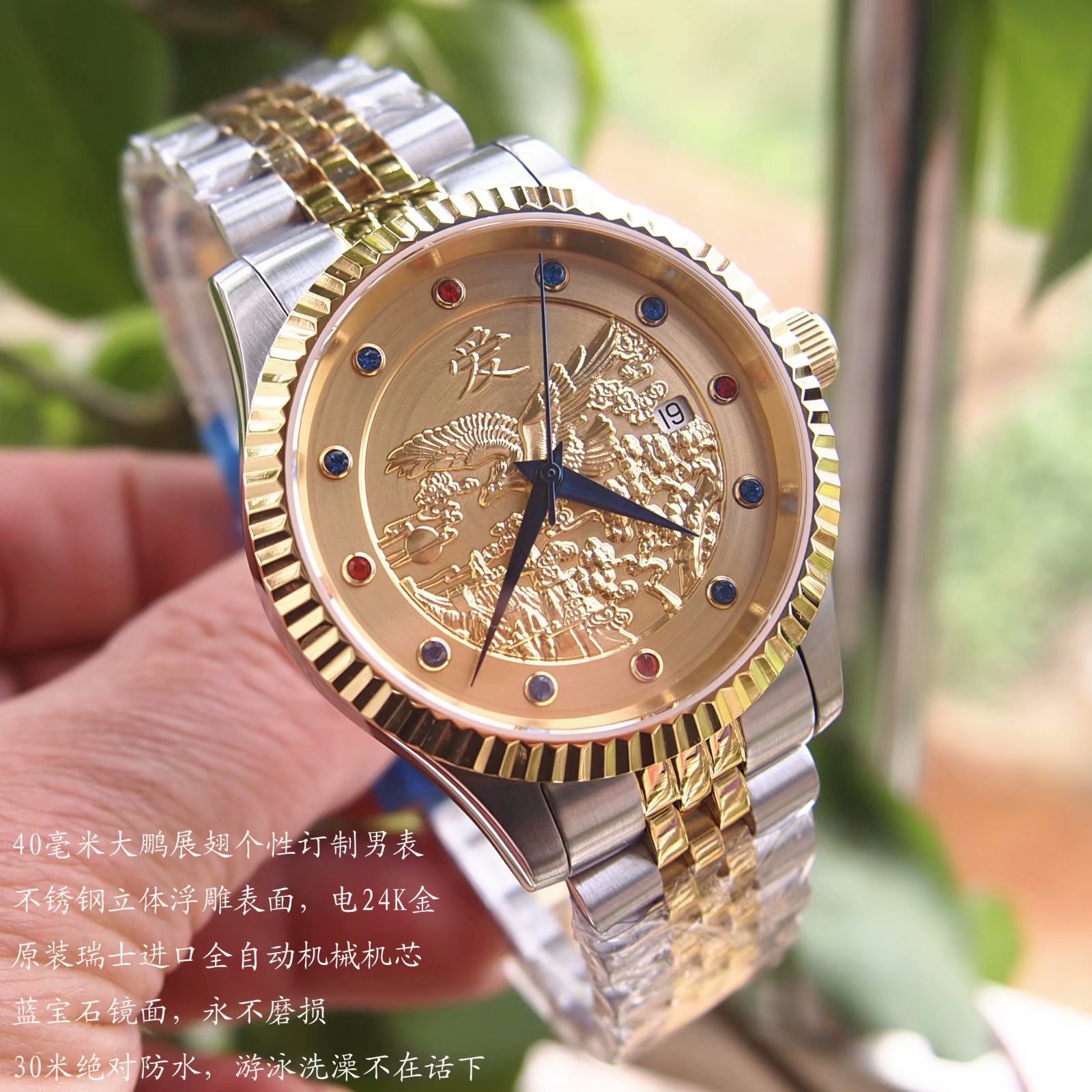 不锈钢间金立体浮雕大鹏展翅+“爱”-个性订制全自动机械男表
